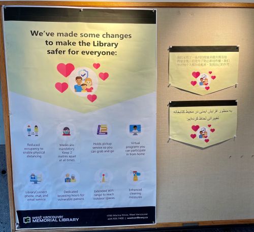 Even though only part of the large English Covid poster in the West Vancouver Memorial Library has been translated into Chinese and Persian (Figure 5), this translation effort stands out as important not only for accessing information in languages other than English but also for reinforcing spaces of belonging for linguistic minorities. To develop this practice further, the full poster could be translated rather than only the top part and attention could be given to making the languages on bilingual or trilingual signage equal in size and prominence. While some of the symbols used on the English poster communicate the message effectively without the need for words, other symbols are more ambiguous.