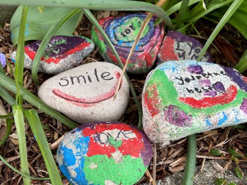More common than bilingual or trilingual Covid signs in West Vancouver are handmade artifacts indirectly related to Covid, containing symbols together with English slogans, known as ‘language objects’. While people in many places around the world displayed pictures of rainbows and hearts in their windows or on front doors, West Vancouverites tended to create signs of care, solidarity and hope in public spaces rather than in private homes. Slogans such as ‘smile’, ‘love’, ‘you’re the best’ appeared on objects in the environment, like stones or trees. The ‘language objects’ in Figure 6 serve no informational or utilitarian purpose, rather they portray messages of care, hope, positivity and solidarity during difficult times.