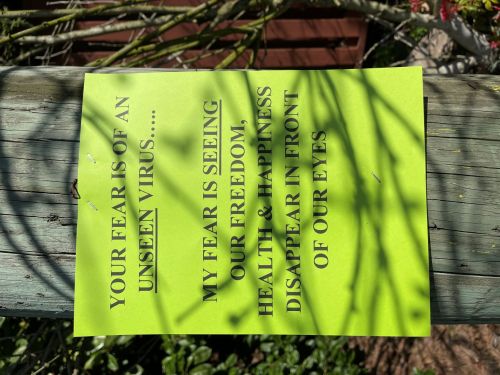 Another way in which the public interacted with the linguistic landscape of West Vancouver, was through grassroots homemade signs in the form of monolingual (English only) posters taped to trees, lamp posts or walls in public places. Such posters tended to voice political or philosophical viewpoints on the pandemic, as seen in Figure 7.