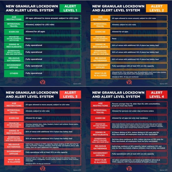 The latest response by the Department of Health is to introduce new quarantine vocabulary: ‘granular lockdown’ which refers to micro-level quarantine for critical areas that have a surge in COVID-19 cases.  Beginning September 16, 2021, 57 areas in the National Capital Region were put under granular lockdown. This means individuals staying in houses, residential buildings, streets, blocks, villages, or barangays that have been identified as ‘critical areas’ are forced to strictly stay indoors for 14 consecutive days. As affected households absolutely cannot leave their residence, the local government units and social welfare department are in charge of sending them food, and military officials are stationed in the areas to ensure compliance.